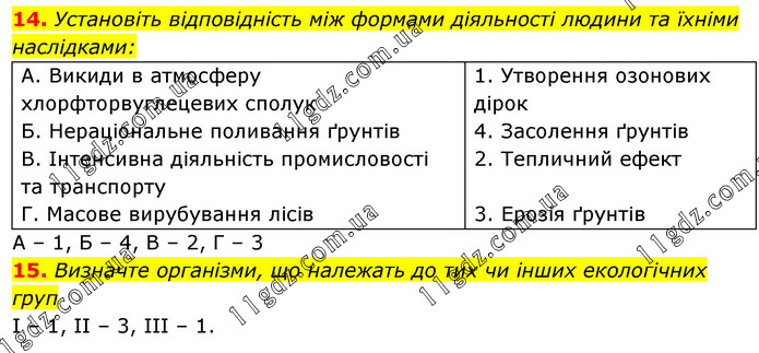 Установіть відповідність між формами діяльності людини та їхніми наслідками: А. Викиди в атмосферу хлорфторвуглецевих сполук Б. Нераціональне поливання ґрунтів В. Інтенсивна діяльність промисловості та транспорту Г. Масове вирубування лісів 1. Утворення озонових дірок 4. Засолення ґрунтів 2. Тепличний ефект 3. Ерозія ґрунтів А – 1, Б – 4, В – 2, Г – 3 15. Визначте організми, що належать до тих чи інших екологічних груп І – 1, ІІ – 3, ІІІ – 1.