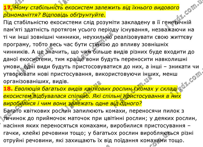 Чому стабільність екосистем залежить від їхнього видового різноманіття? Відповідь обґрунтуйте. Під стабільністю екосистеми слід розуміти закладену в її генетичній пам'яті здатність протягом усього періоду існування, незважаючи на ті чи інші зовнішні чинники, неухильно реалізовувати свою життєву програму, тобто весь час бути стійкою до впливу зовнішніх чинників. А це значить, що чим більше видів різних буде входити до даної екосистеми, тим краще вони будуть переносити навколишні умови, одні види будуть пристосовуватися до них, а інші – зникати чи утворювати нові пристосування, використовуючи інших, менш організованіших, видів. 18. Еволюція багатьох видів квіткових рослин і комах у складі екосистем відбувалася спільно. Які спільні пристосування в них виробилися і чим вони залежать одне від одного? Багато квіткових рослин запилюють комахи, переносячи пилок з тичинок до приймочок маточок при цвітінні рослин; у деяких рослин, насіння яких переносяться комахами, виробилися пристосування – гачки, клейкі речовини тощо; у багатьох рослин виробляються різні отруйні речовини, які захищають їх від поїдання комахами тощо.