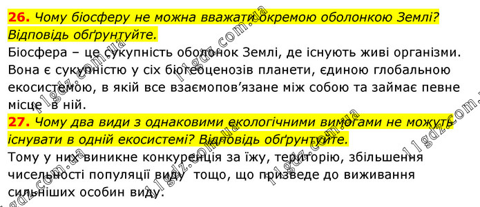 Чому біосферу не можна вважати окремою оболонкою Землі? Відповідь обґрунтуйте. Біосфера – це сукупність оболонок Землі, де існують живі організми. Вона є сукупністю у сіх біогеоценозів планети, єдиною глобальною екосистемою, в якій все взаємопов’язане між собою та займає певне місце в ній. 27. Чому два види з однаковими екологічними вимогами не можуть існувати в одній екосистемі? Відповідь обґрунтуйте. Тому у них виникне конкуренція за їжу, територію, збільшення чисельності популяції виду тощо, що призведе до виживання сильніших особин виду.