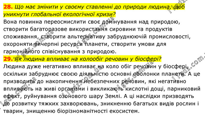 Що має змінити у своєму ставленні до природи людина, щоб уникнути глобальної екологічної кризи? Вона повинна переосмислити своє домінування над природою, створити багаторазове використання сировини та продуктів споживання, створити альтернативу забруднюючій промисловості, охороняти вичерпні ресурси планети, створити умови для гармонійного співіснування з природою. 29. Як людина впливає на колообіг речовин у біосфері? Людина дуже негативно впливає на коло обіг речовин у біосфері, оскільки забруднює своєю діяльністю основні оболонки планети. А це призводить до накопичення небезпечних речовин, які негативно впливають на живі організми і викликають кислотні дощі, парниковий ефект, руйнування озонового шару Землі. А ці наслідки призводять до розвитку тяжких захворювань, зникненню багатьох видів рослин і тварин, знищенню біорізноманітності екосистем.