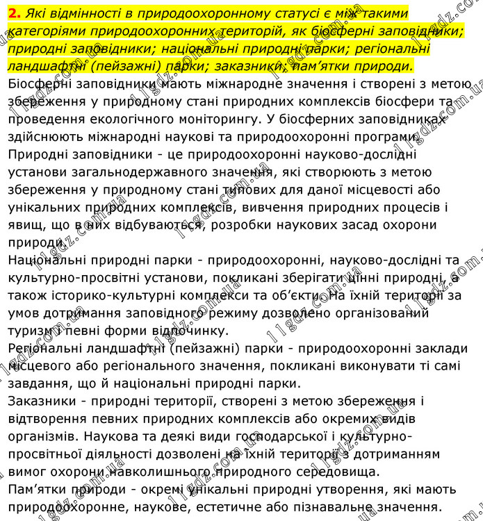 Які відмінності в природоохоронному статусі є між такими категоріями природоохоронних територій, як біосферні заповідники; природні заповідники; національні природні парки; регіональні ландшафтні (пейзажні) парки; заказники; пам’ятки природи. Біосферні заповідники мають міжнародне значення і створені з метою збереження у природному стані природних комплексів біосфери та проведення екологічного моніторингу. У біосферних заповідниках здійснюють міжнародні наукові та природоохоронні програми. Природні заповідники - це природоохоронні науково-дослідні установи загальнодержавного значення, які створюють з метою збереження у природному стані типових для даної місцевості або унікальних природних комплексів, вивчення природних процесів і явищ, що в них відбуваються, розробки наукових засад охорони природи. Національні природні парки - природоохоронні, науково-дослідні та культурно-просвітні установи, покликані зберігати цінні природні, а також історико-культурні комплекси та об’єкти. На їхній території за умов дотримання заповідного режиму дозволено організований туризм і певні форми відпочинку. Регіональні ландшафтні (пейзажні) парки - природоохоронні заклади місцевого або регіонального значення, покликані виконувати ті самі завдання, що й національні природні парки. Заказники - природні території, створені з метою збереження і відтворення певних природних комплексів або окремих видів організмів. Наукова та деякі види господарської і культурно-просвітньої діяльності дозволені на їхній території з дотриманням вимог охорони навколишнього природного середовища. Пам’ятки природи - окремі унікальні природні утворення, які мають природоохоронне, наукове, естетичне або пізнавальне значення.