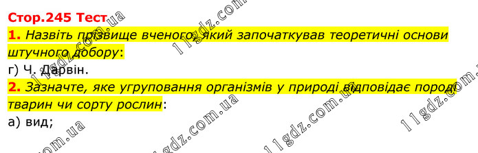 Тест 1. Назвіть прізвище вченого, який започаткував теоретичні основи штучного добору: г) Ч. Дарвін. 2. Зазначте, яке угруповання організмів у природі відповідає породі тварин чи сорту рослин: а) вид;