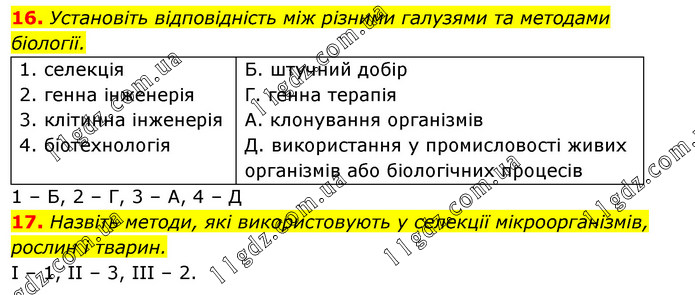 Установіть відповідність між різними галузями та методами біології. 1. селекція 2. генна інженерія 3. клітинна інженерія 4. біотехнологія Б. штучний добір Г. генна терапія А. клонування організмів Д. використання у промисловості живих організмів або біологічних процесів 1 – Б, 2 – Г, 3 – А, 4 – Д 17. Назвіть методи, які використовують у селекції мікроорганізмів, рослин і тварин. І – 1, ІІ – 3, ІІІ – 2.