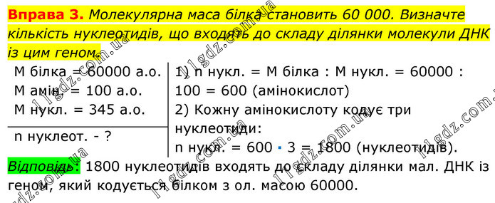 Молекулярна маса білка становить 60 000. Визначте кількість нуклеотидів, що входять до складу ділянки молекули ДНК із цим геном. М білка = 60000 а.о. М амін. = 100 а.о. М нукл. = 345 а.о. 1) n нукл. = М білка : М нукл. = 60000 : 100 = 600 (амінокислот) 2) Кожну амінокислоту кодує три нуклеотиди: n нукл. = 600 ∙ 3 = 1800 (нуклеотидів). n нуклеот. - ? Відповідь: 1800 нуклеотидів входять до складу ділянки мал. ДНК із геном, який кодується білком з ол. масою 60000.