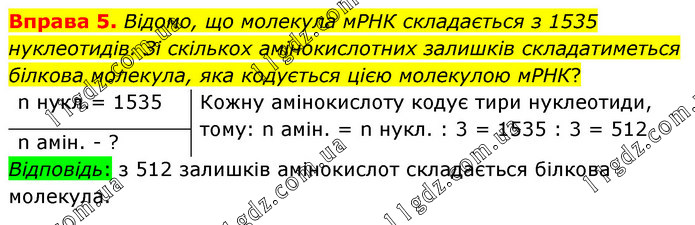 Відомо, що молекула мРНК складається з 1535 нуклеотидів. Зі скількох амінокислотних залишків складатиметься білкова молекула, яка кодується цією молекулою мРНК? n нукл.= 1535 Кожну амінокислоту кодує тири нуклеотиди, тому: n амін. = n нукл. : 3 = 1535 : 3 = 512 n амін. - ? Відповідь: з 512 залишків амінокислот складається білкова молекула.