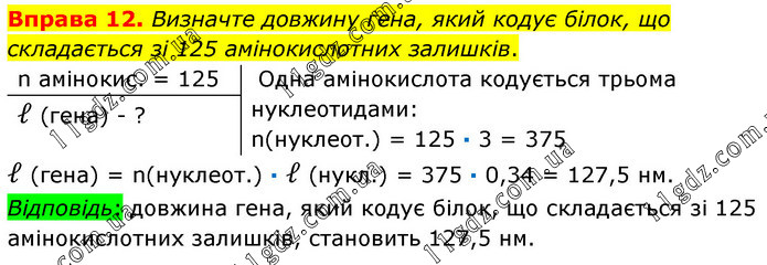 Визначте довжину гена, який кодує білок, що складається зі 125 амінокислотних залишків. n амінокис. = 125 Одна амінокислота кодується трьома нуклеотидами: n(нуклеот.) = 125 ∙ 3 = 375 l (гена) - ? l (гена) = n(нуклеот.) ∙ l (нукл.) = 375 ∙ 0,34 = 127,5 нм. Відповідь: довжина гена, який кодує білок, що складається зі 125 амінокислотних залишків, становить 127,5 нм.