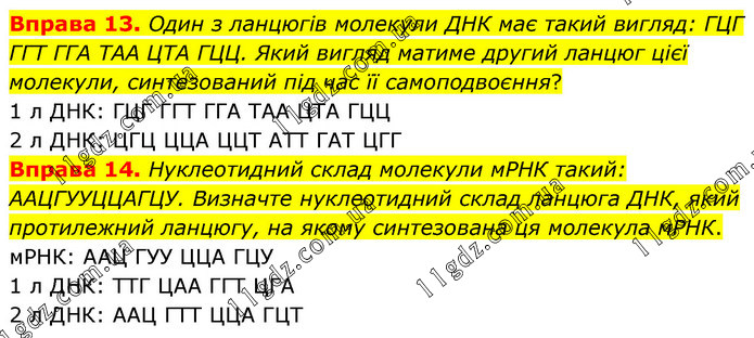 Один з ланцюгів молекули ДНК має такий вигляд: ГЦГ ГГТ ГГА ТАА ЦТА ГЦЦ. Який вигляд матиме другий ланцюг цієї молекули, синтезований під час її самоподвоєння? 1 л ДНК: ГЦГ ГГТ ГГА ТАА ЦТА ГЦЦ 2 л ДНК: ЦГЦ ЦЦА ЦЦТ АТТ ГАТ ЦГГ Вправа 14. Нуклеотидний склад молекули мРНК такий: ААЦГУУЦЦАГЦУ. Визначте нуклеотидний склад ланцюга ДНК, який протилежний ланцюгу, на якому синтезована ця молекула мРНК. мРНК: ААЦ ГУУ ЦЦА ГЦУ 1 л ДНК: ТТГ ЦАА ГГТ ЦГА 2 л ДНК: ААЦ ГТТ ЦЦА ГЦТ