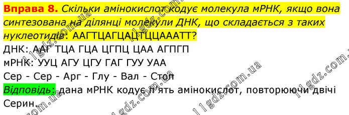 Скільки амінокислот кодує молекула мРНК, якщо вона синтезована на ділянці молекули ДНК, що складається з таких нуклеотидів: ААГТЦАГЦАЦТЦЦАААТТ? ДНК: ААГ ТЦА ГЦА ЦГПЦ ЦАА АГПГП мРНК: УУЦ АГУ ЦГУ ГАГ ГУУ УАА Сер - Сер - Арг - Глу - Вал - Стоп Відповідь: дана мРНК кодує п’ять амінокислот, повторюючи двічі Серин.