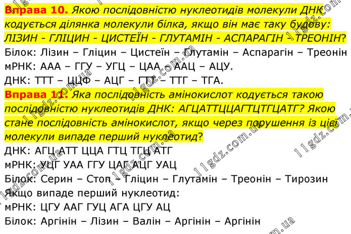 Якою послідовністю нуклеотидів молекули ДНК кодується ділянка молекули білка, якщо він має таку будову: ЛІЗИН - ГЛІЦИН - ЦИСТЕЇН - ГЛУТАМІН - АСПАРАГІН - ТРЕОНІН? Білок: Лізин – Гліцин – Цистеїн – Глутамін – Аспарагін – Треонін мРНК: ААА – ГГУ – УГЦ – ЦАА – ААЦ – АЦУ. ДНК: ТТТ – ЦЦФ – АЦГ – ГТТ – ТТГ – ТГА. Вправа 11. Яка послідовність амінокислот кодується такою послідовністю нуклеотидів ДНК: АГЦАТТЦЦАГТЦТГЦАТГ? Якою стане послідовність амінокислот, якщо через порушення із цієї молекули випаде перший нуклеотид? ДНК: АГЦ АТТ ЦЦА ГТЦ ТГЦ АТГ мРНК: УЦГ УАА ГГУ ЦАГ АЦГ УАЦ Білок: Серин – Стоп – Гліцин – Глутамін – Треонін – Тирозин Якщо випаде перший нуклеотид: мРНК: ЦГУ ААГ ГУЦ АГА ЦГУ АЦ Білок: Аргінін – Лізин – Валін – Аргінін – Аргінін