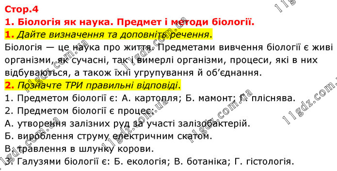 Стор.4 1. Біологія як наука. Предмет і методи біології. 1. Дайте визначення та доповніть речення. Біологія — це наука про життя. Предметами вивчення біології є живі організми, як сучасні, так і вимерлі організми, процеси, які в них відбуваються, а також їхні угрупування й об’єднання. 2. Позначте ТРИ правильні відповіді. 1. Предметом біології є: А. картопля; Б. мамонт; Г. пліснява. 2. Предметом біології є процес: А. утворення залізних руд за участі залізобактерій. Б. вироблення струму електричним скатом. В. травлення в шлунку корови. 3. Галузями біології є: Б. екологія; В. ботаніка; Г. гістологія.