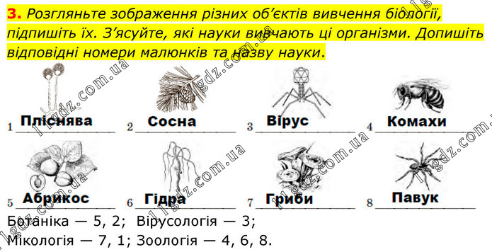 3. Розгляньте зображення різних об’єктів вивчення біології, підпишіть їх. З’ясуйте, які науки вивчають ці організми. Допишіть відповідні номери малюнків та назву науки. Ботаніка — 5, 2; Вірусологія — 3; Мікологія — 7, 1; Зоологія — 4, 6, 8.