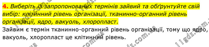 4. Виберіть із запропонованих термінів зайвий та обґрунтуйте свій вибір: клітинний рівень організації, тканинно-органний рівень організації, ядро, вакуоль, хлоропласт. Зайвим є термін тканинно-органний рівень організації, тому що ядро, вакуоль, хлоропласт це клітинний рівень.