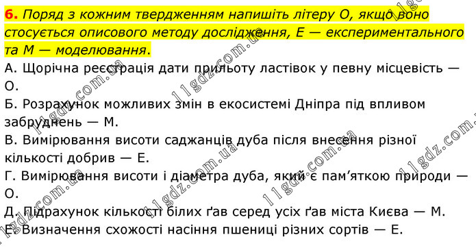 6. Поряд з кожним твердженням напишіть літеру О, якщо воно стосується описового методу дослідження, Е — експериментального та М — моделювання. А. Щорічна реєстрація дати прильоту ластівок у певну місцевість — О. Б. Розрахунок можливих змін в екосистемі Дніпра під впливом забруднень — М. В. Вимірювання висоти саджанців дуба після внесення різної кількості добрив — Е. Г. Вимірювання висоти і діаметра дуба, який є пам’яткою природи — О. Д. Підрахунок кількості білих ґав серед усіх ґав міста Києва — М. Е. Визначення схожості насіння пшениці різних сортів — Е.