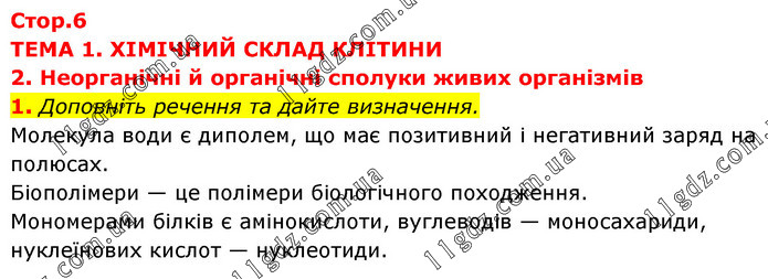 ТЕМА 1. ХІМІЧНИЙ СКЛАД КЛІТИНИ 2. Неорганічні й органічні сполуки живих організмів 1. Доповніть речення та дайте визначення. Молекула води є диполем, що має позитивний і негативний заряд на полюсах. Біополімери — це полімери біологічного походження. Мономерами білків є амінокислоти, вуглеводів — моносахариди, нуклеїнових кислот — нуклеотиди.