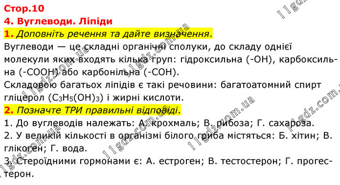 4. Вуглеводи. Ліпіди 1. Доповніть речення та дайте визначення. Вуглеводи — це складні органічні сполуки, до складу однієї молекули яких входять кілька груп: гідроксильна (-ОН), карбоксиль-на (-СООН) або карбонільна (-СОН). Складовою багатьох ліпідів є такі речовини: багатоатомний спирт гліцерол (С3Н5(ОН)3) і жирні кислоти. 2. Позначте ТРИ правильні відповіді. 1. До вуглеводів належать: А. крохмаль; В. рибоза; Г. сахароза. 2. У великій кількості в організмі білого гриба містяться: Б. хітин; В. глікоген; Г. вода. 3. Стероїдними гормонами є: А. естроген; В. тестостерон; Г. прогес-терон.