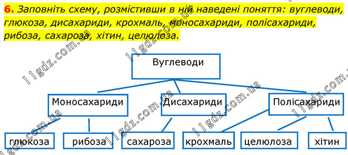 Заповніть схему, розмістивши в ній наведені поняття: вуглеводи, глюкоза, дисахариди, крохмаль, моносахариди, полісахариди, рибоза, сахароза, хітин, целюлоза.