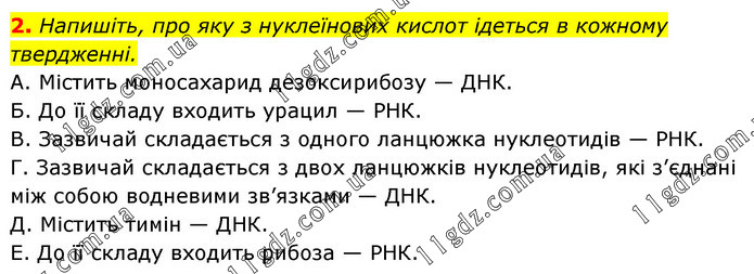 Напишіть, про яку з нуклеїнових кислот ідеться в кожному твердженні. А. Містить моносахарид дезоксирибозу — ДНК. Б. До її складу входить урацил — РНК. В. Зазвичай складається з одного ланцюжка нуклеотидів — РНК. Г. Зазвичай складається з двох ланцюжків нуклеотидів, які з’єднані між собою водневими зв’язками — ДНК. Д. Містить тимін — ДНК. Е. До її складу входить рибоза — РНК.