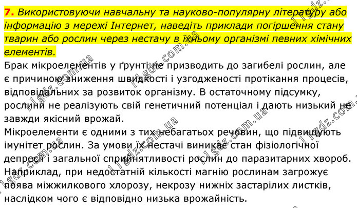 Використовуючи навчальну та науково-популярну літературу або інформацію з мережі Інтернет, наведіть приклади погіршення стану тварин або рослин через нестачу в їхньому організмі певних хімічних елементів. Брак мікроелементів у ґрунті не призводить до загибелі рослин, але є причиною зниження швидкості і узгодженості протікання процесів, відповідальних за розвиток організму. В остаточному підсумку, рослини не реалізують свій генетичний потенціал і дають низький не завжди якісний врожай. Мікроелементи є одними з тих небагатьох речовин, що підвищують імунітет рослин. За умови їх нестачі виникає стан фізіологічної депресії і загальної сприйнятливості рослин до паразитарних хвороб. Наприклад, при недостатній кількості магнію рослинам загрожує поява міжжилкового хлорозу, некрозу нижніх застарілих листків, наслідком чого є відповідно низька врожайність.