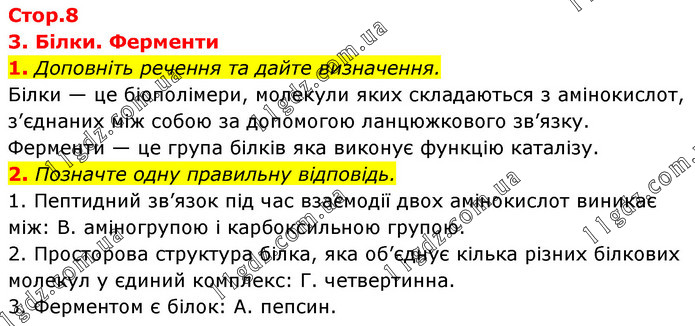 3. Білки. Ферменти 1. Доповніть речення та дайте визначення. Білки — це біополімери, молекули яких складаються з амінокислот, з’єднаних між собою за допомогою ланцюжкового зв’язку. Ферменти — це група білків яка виконує функцію каталізу. 2. Позначте одну правильну відповідь. 1. Пептидний зв’язок під час взаємодії двох амінокислот виникає між: В. аміногрупою і карбоксильною групою. 2. Просторова структура білка, яка об’єднує кілька різних білкових молекул у єдиний комплекс: Г. четвертинна. 3. Ферментом є білок: А. пепсин.