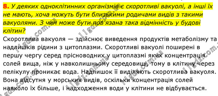 У деяких одноклітинних організмів є скоротливі вакуолі, а інші їх не мають, хоча можуть бути близькими родичами видів з такими вакуолями. З чим може бути пов'язана така відмінність у будові клітин? Скоротлива вакуоля — здійснює виведення продуктів метаболізму та надлишків рідини з цитоплазми. Скоротливі вакуолі поширені в першу чергу серед прісноводних у цитоплазмі яких концентрація солей вища, ніж у навколишньому середовищі, тому в клітину через пелікулу проникає вода. Надлишок її виділяють скоротлива вакуоля. Вона відсутня у морських видів, оскільки концентрація солей навколо їх більше, і надходження води у клітини не відбувається.