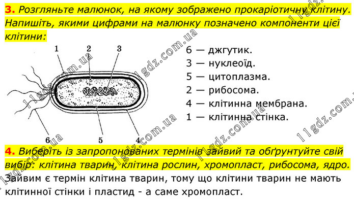 3. Розгляньте малюнок, на якому зображено прокаріотичну клітину. Напишіть, якими цифрами на малюнку позначено компоненти цієї клітини: 6 — джгутик. 3 — нуклеоїд. 5 — цитоплазма. 2 — рибосома. 4 — клітинна мембрана. 1 — клітинна стінка. 4. Виберіть із запропонованих термінів зайвий та обґрунтуйте свій вибір: клітина тварин, клітина рослин, хромопласт, рибосома, ядро. Зайвим є термін клітина тварин, тому що клітини тварин не мають клітинної стінки і пластид - а саме хромопласт.