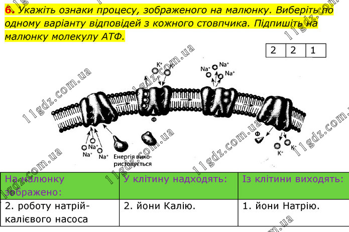 Укажіть ознаки процесу, зображеного на малюнку. Виберіть по одному варіанту відповідей з кожного стовпчика. Підпишіть на малюнку молекулу АТФ.