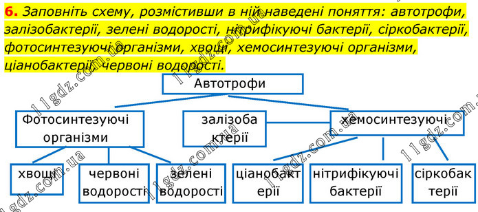 Заповніть схему, розмістивши в ній наведені поняття: автотрофи, залізобактерії, зелені водорості, нітрифікуючі бактерії, сіркобактерії, фотосинтезуючі організми, хвощі, хемосинтезуючі організми, ціанобактерії, червоні водорості.