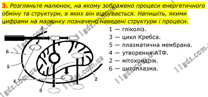Розгляньте малюнок, на якому зображено процеси енергетичного обміну та структури, в яких він відбувається. Напишіть, якими цифрами на малюнку позначено наведені структури і процеси. 1 — гліколіз. 3 — цикл Кребса. 5 — плазматична мембрана. 4 — утворення АТФ. 2 — мітохондрія. 6 — цитоплазма.