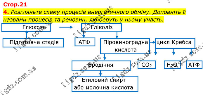 Розгляньте схему процесів енергетичного обміну. Доповніть її назвами процесів та речовин, які беруть у ньому участь.