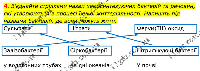 З'єднайте стрілками назви хемосинтезуючих бактерій та речовин, які утворюються в процесі їхньої життєдіяльності. Напишіть під назвами бактерій, де вони можуть жити.