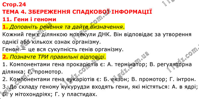 ТЕМА 4. ЗБЕРЕЖЕННЯ СПАДКОВОЇ ІНФОРМАЦІЇ 11. Гени і геноми 1. Доповніть речення та дайте визначення. Кожний ген є ділянкою молекули ДНК. Він відповідає за утворення однієї або кількох ознак організму. Геном — це вся сукупність генів організму. 2. Позначте ТРИ правильні відповіді. 1. Компонентами гена прокаріотів є: А. термінатор; В. регуляторна ділянка; Г. промотор. 2. Компонентами гена еукаріотів є: Б. екзон; В. промотор; Г. інтрон. 3. До складу геному кукурудзи входять гени, які містяться: А. в ядрі; Б. у мітохондріях; Г. у пластидах.