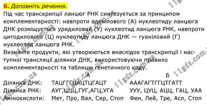Доповніть речення. Під час транскрипції ланцюг РНК синтезується за принципом комплементарності: навпроти аденілового (А) нуклеотиду ланцюга ДНК розміщується уридиловий (У) нуклеотид ланцюга РНК, навпроти цитодилового (Ц) нуклеотиду ланцюга ДНК — гуаніловий (Г) нуклеотид ланцюга РНК. Визначте продукти, які утворюються внаслідок транскрипції і нас-тупної трансляції ділянки ДНК, використовуючи правило комплементарності та таблицю генетичного коду. Ділянка ДНК: Ділянка РНК: Амінокислоти: А ТАЦГГГЦАЦТЦГАЦТ АУГ,ЦЦЦ,ГУГ,АГЦ,УГА Мет, Про, Вал, Сер, Стоп Б АААГАГТГГЦТГАТТ УУУ, ЦУЦ, АЦЦ, ГАЦ, УАА Фен, Лей, Тре, Асп, Стоп