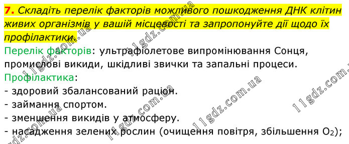 Складіть перелік факторів можливого пошкодження ДНК клітин живих організмів у вашій місцевості та запропонуйте дії щодо їх профілактики. Перелік факторів: ультрафіолетове випромінювання Сонця, промислові викиди, шкідливі звички та запальні процеси. Профілактика: - здоровий збалансований раціон. - займання спортом. - зменшення викидів у атмосферу. - насадження зелених рослин (очищення повітря, збільшення О2);