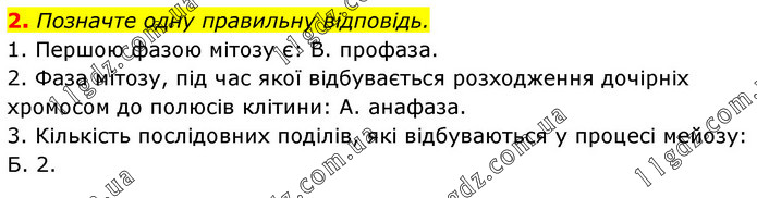 Позначте одну правильну відповідь. 1. Першою фазою мітозу є: В. профаза. 2. Фаза мітозу, під час якої відбувається розходження дочірніх хромосом до полюсів клітини: А. анафаза. 3. Кількість послідовних поділів, які відбуваються у процесі мейозу: Б. 2.