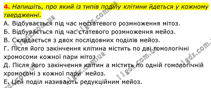 Напишіть, про який із типів поділу клітини йдеться у кожному твердженні. А. Відбувається під час нестатевого розмноження мітоз. Б. Відбувається під час статевого розмноження мейоз. В. Складається з двох послідовних поділів мейоз. Г. Після його закінчення клітина містить по дві гомологічні хромосоми кожної пари мітоз. Д. Після його закінчення клітин а містить по одній гомологічній хромосомі з кожної пари мейоз. Е. Цей поділ називають редукційним мейоз.