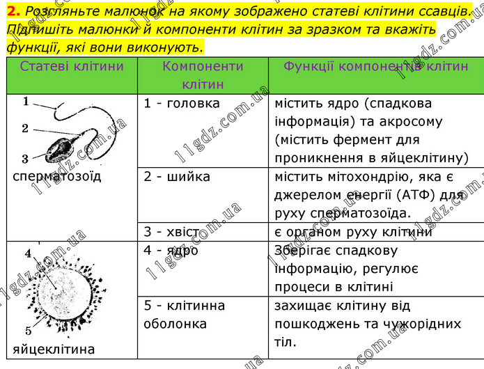 Розгляньте малюнок на якому зображено статеві клітини ссавців. Підпишіть малюнки й компоненти клітин за зразком та вкажіть функції, які вони виконують.