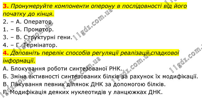 3. Пронумеруйте компоненти оперону в послідовності від його початку до кінця. 2. – А. Оператор. 1. – Б. Промотор. 3. – В. Структурні гени. 4. – Г. Термінатор. 4. Доповніть перелік способів регуляції реалізації спадкової інформації. А. Блокування роботи синтезованої РНК. Б. Зміна активності синтезованих білків за рахунок їх модифікації. В. Пакування певних ділянок ДНК за допомогою білків. Г. Модифікація деяких нуклеотидів у ланцюжках ДНК.