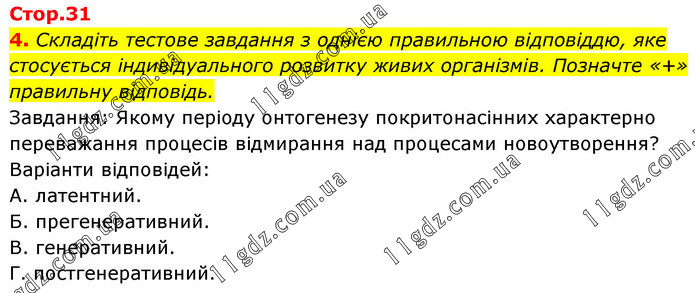 Складіть тестове завдання з однією правильною відповіддю, яке стосується індивідуального розвитку живих організмів. Позначте «+» правильну відповідь. Завдання: Якому періоду онтогенезу покритонасінних характерно переважання процесів відмирання над процесами новоутворення? Варіанти відповідей: А. латентний. Б. прегенеративний. В. генеративний. Г. постгенеративний.
