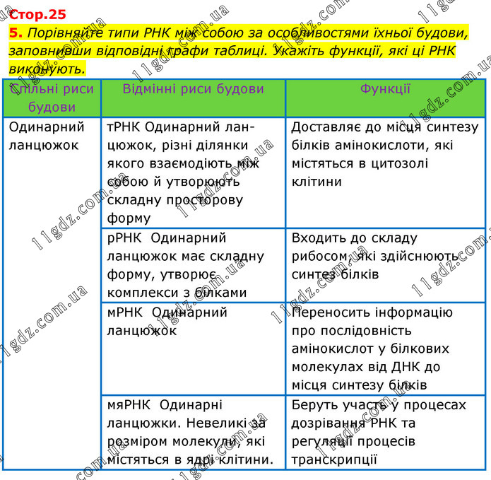 Порівняйте типи РНК між собою за особливостями їхньої будови, заповнивши відповідні графи таблиці. Укажіть функції, які ці РНК виконують.
