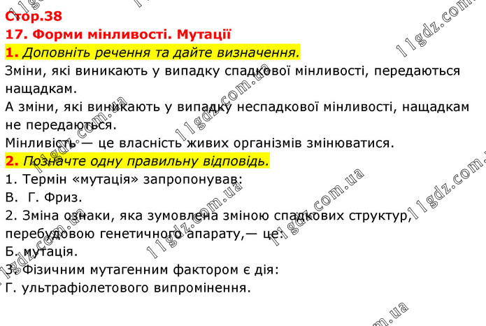 17. Форми мінливості. Мутації 1. Доповніть речення та дайте визначення. Зміни, які виникають у випадку спадкової мінливості, передаються нащадкам. А зміни, які виникають у випадку неспадкової мінливості, нащадкам не передаються. Мінливість — це власність живих організмів змінюватися. 2. Позначте одну правильну відповідь. 1. Термін «мутація» запропонував: В. Г. Фриз. 2. Зміна ознаки, яка зумовлена зміною спадкових структур, перебудовою генетичного апарату,— це: Б. мутація. 3. Фізичним мутагенним фактором є дія: Г. ультрафіолетового випромінення.