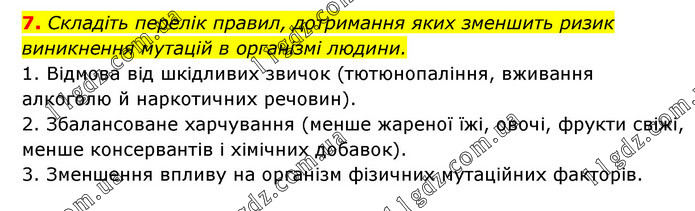 Складіть перелік правил, дотримання яких зменшить ризик виникнення мутацій в організмі людини. 1. Відмова від шкідливих звичок (тютюнопаління, вживання алкоголю й наркотичних речовин). 2. Збалансоване харчування (менше жареної їжі, овочі, фрукти свіжі, менше консервантів і хімічних добавок). 3. Зменшення впливу на організм фізичних мутаційних факторів.