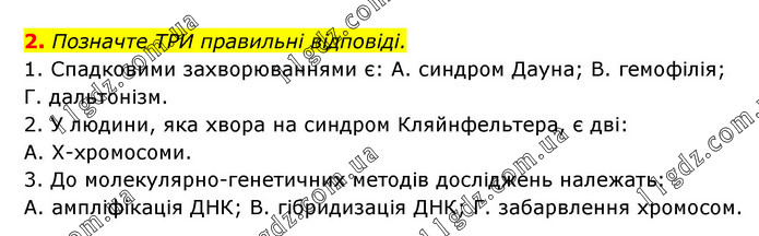 Позначте ТРИ правильні відповіді. 1. Спадковими захворюваннями є: А. синдром Дауна; В. гемофілія; Г. дальтонізм. 2. У людини, яка хвора на синдром Кляйнфельтера, є дві: А. Х-хромосоми. 3. До молекулярно-генетичних методів досліджень належать: А. ампліфікація ДНК; В. гібридизація ДНК; Г. забарвлення хромосом.