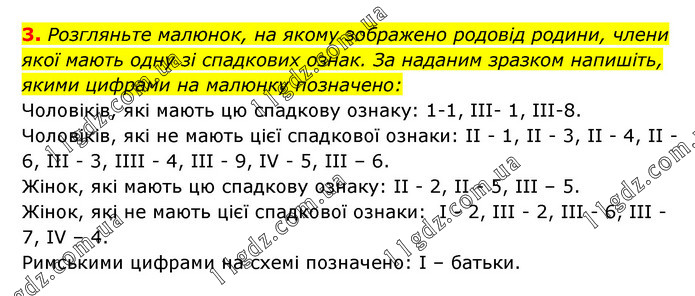 Розгляньте малюнок, на якому зображено родовід родини, члени якої мають одну зі спадкових ознак. За наданим зразком напишіть, якими цифрами на малюнку позначено: Чоловіків, які мають цю спадкову ознаку: 1-1, III- 1, ІІІ-8. Чоловіків, які не мають цієї спадкової ознаки: ІІ - 1, ІІ - 3, ІІ - 4, ІІ - 6, ІІІ - 3, ІІІІ - 4, ІІІ - 9, ІV - 5, ІІІ – 6. Жінок, які мають цю спадкову ознаку: ІІ - 2, ІІ - 5, ІІІ – 5. Жінок, які не мають цієї спадкової ознаки: І - 2, ІІІ - 2, ІІІ - 6, ІІІ - 7, ІV – 4. Римськими цифрами на схемі позначено: І – батьки.