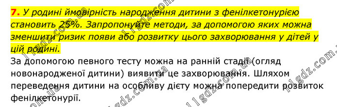 У родині ймовірність народження дитини з фенілкетонурією становить 25%. Запропонуйте методи, за допомогою яких можна зменшити ризик появи або розвитку цього захворювання у дітей у цій родині. За допомогою певного тесту можна на ранній стадії (огляд новонародженої дитини) виявити це захворювання. Шляхом переведення дитини на особливу дієту можна попередити розвиток фенілкетонурії.