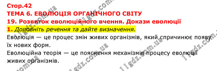 ТЕМА 6. ЕВОЛЮЦІЯ ОРГАНІЧНОГО СВІТУ 19. Розвиток еволюційного вчення. Докази еволюції 1. Доповніть речення та дайте визначення. Еволюція — це процес змін живих організмів, який спричинює появу їх нових форм. Еволюційна теорія — це пояснення механізмів процесу еволюції живих організмів.
