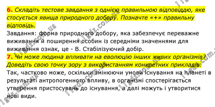 6. Складіть тестове завдання з однією правильною відповіддю, яке стосується явища природного добору. Позначте «+» правильну відповідь. Завдання: форма природного добору, яка забезпечує переважне виживання й поширення особин із середніми значеннями для виживання ознак, це - В. Стабілізуючий добір. 7. Чи може людина впливати на еволюцію інших живих організмів? Доведіть свою точку зору з використанням конкретних прикладів. Так, частково може, оскільки змінюючи умови існування на планеті в результаті антропогенного впливу, в організмі спостерігається утворення пристосувань до існування, а далі можуть і утворитися нові види.