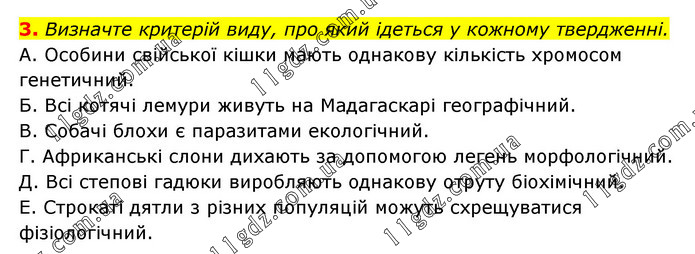 Визначте критерій виду, про який ідеться у кожному твердженні. А. Особини свійської кішки мають однакову кількість хромосом генетичний. Б. Всі котячі лемури живуть на Мадагаскарі географічний. В. Собачі блохи є паразитами екологічний. Г. Африканські слони дихають за допомогою легень морфологічний. Д. Всі степові гадюки виробляють однакову отруту біохімічний. Е. Строкаті дятли з різних популяцій можуть схрещуватися фізіологічний.