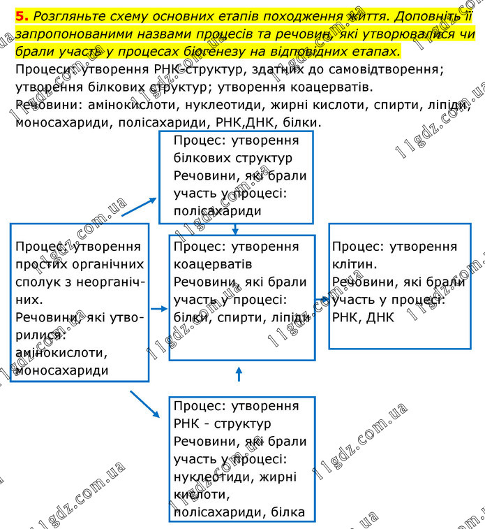 Розгляньте схему основних етапів походження життя. Доповніть її запропонованими назвами процесів та речовин, які утворювалися чи брали участь у процесах біогенезу на відповідних етапах. Процеси: утворення РНК-структур, здатних до самовідтворення; утворення білкових структур; утворення коацерватів. Речовини: амінокислоти, нуклеотиди, жирні кислоти, спирти, ліпіди, моносахариди, полісахариди, РНК, ДНК, білки.