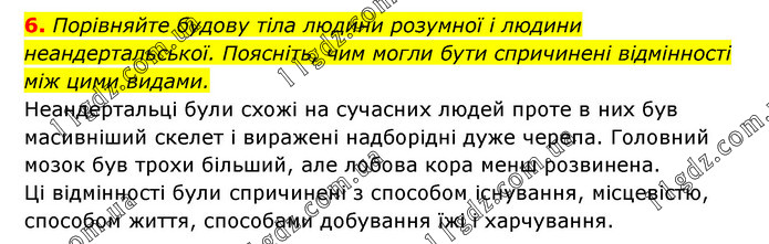 6. Порівняйте будову тіла людини розумної і людини неандертальської. Поясніть, чим могли бути спричинені відмінності між цими видами. Неандертальці були схожі на сучасних людей проте в них був масивніший скелет і виражені надборідні дуже черепа. Головний мозок був трохи більший, але лобова кора менш розвинена. Ці відмінності були спричинені з способом існування, місцевістю, способом життя, способами добування їжі і харчування.