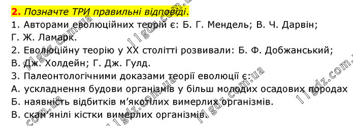 Позначте ТРИ правильні відповіді. 1. Авторами еволюційних теорій є: Б. Г. Мендель; В. Ч. Дарвін; Г. Ж. Ламарк. 2. Еволюційну теорію у XX столітті розвивали: Б. Ф. Добжанський; В. Дж. Холдейн; Г. Дж. Гулд. 3. Палеонтологічними доказами теорії еволюції є: А. ускладнення будови організмів у більш молодих осадових породах Б. наявність відбитків м’якотілих вимерлих організмів. В. скам’янілі кістки вимерлих організмів.